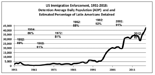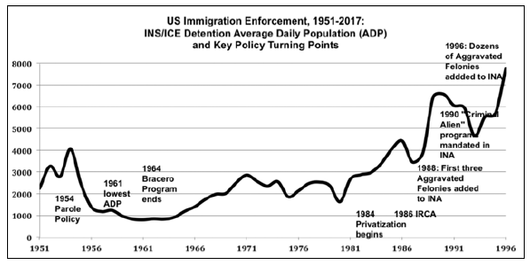 La legislación y las políticas importantes que apoyan la mayor parte del crecimiento de la detención de inmigrantes en la posguerra, estaban vigentes en 1996. La población diaria promedio (ADP) de los centros de detención del INS y contratados por el INS entre 1952 y 1996 pasaron de un punto bajo de 906 en 1961 a un pico de 7.735 en 1996 o por un factor de 8,54. Luego del fin de la Operación Espaldas Mojadas en 1954, la población diaria promedio mostró un modesto aumento, en particular después del fin del programa Bracero en 1964. Entre comienzos de los años 60 y comienzos de los 80, hubo cierto crecimiento, en particular en este, el ADP. En la época de la solicitud del IRCA en 1986 al fiscal general para que acelerara el retiro de «extranjeros criminales», no había espacios de camas suficientes para ordenar la detención de estos deportados. Varias actas del congreso de allí en adelante instigaron la adición de delitos agravados (delitos que motivaban la deportación particular solo para no ciudadanos) hasta que, en 1988, 1990 y 1996 siguieron la Ley de Inmigración y Nacionalidad y la creación de programas de enemigos extranjeros destinados a aumentar los retiros y espacios de cama. La privatización comenzó en 1984, en parte como un mecanismo para aumentar los espacios de dormitorio. El aspecto obligatorio de la detención del IIRIRA se implementó en 1999 (véase el Informe anual de responsabilidad del USDOJ de 1999, p.V-2), lo que allanó el camino para un ADP superior a 30.000 en 2007. Los datos se recolectaron de los informes anuales de presupuesto de Estados Unidos, datos de inmigración de TRAC y del Proyecto Global Detention.