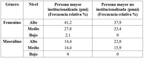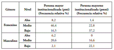 Adicionalmente, respecto del Equilibrio afectivo, en la Tabla No. 5 se observa que el mayor porcentaje de las mujeres pmi y pmni, exhiben un nivel alto (41,2%) y (37,9%) respectivamente; asimismo, las personas mayores hombres no institucionalizados exhiben un nivel Alto (22.8%) y los hombres personas mayores institucionalizadas evidencian un nivel Medio-Alto (14,4%). Con relación a esta variable las mujeres pmi y pmni presentan un mayor equilibrio afectivo en comparación con los hombres.