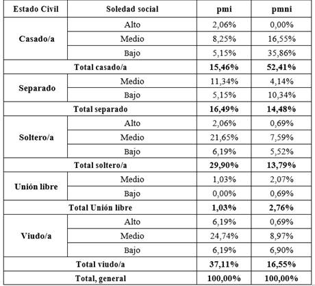Al analizar la soledad social y el estado civil se observa en la Tabla No. 2 que, para las pmi, el mayor porcentaje de soledad social, nivel medio, se presenta en viudo/a y soltero/a, respectivamente. Para las pmni, el mayor porcentaje de soledad social, nivel bajo y medio se presenta en casado/a, respectivamente. Estos resultados demuestran, que las pmi viudos/as y solteros/as respectivamente sufren un mayor nivel de soledad social a diferencia de las (pmni) casados/as.
