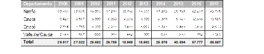 Oficina de las Naciones Unidas contra la Droga y el Delito (2018). Informe de Monitoreo de Territorios Afectados por Cultivos Ilícitos 2017. Bogotá SIMCI-UNOD. https://www.unodc.org/documents/crop-monitoring/Colombia/Colombia_Monitoreo_territorios_afectados_cultivos_ilicitos_2017_Resumen.pdf