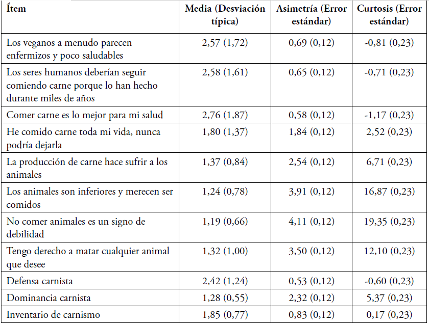 En la Tabla 1 podemos observar los estadísticos descriptivos para los ocho ítems del inventario (la media y su respectiva desviación estándar, los índices de asimetría y curtosis con sus respectivos errores estándar). En términos generales los errores estándar de asimetría y curtosis nos señalan que podemos considerar la muestra como parecida a una distribución normal (valores entre ±2). Podemos apreciar que las puntuaciones para los ítems de ambas dimensiones poseen una leve asimetría positiva que es coherente con las bajas medias de respuesta a los ítems y la acumulación de casos en dicha cola de la distribución. La dispersión de las puntuaciones es relativamente baja y los niveles de curtosis revelan que las respuestas acumuladas en las colas de distribución son más altas que en una curva normal para el caso de la defensa carnista y levemente más bajas para dominio carnista.