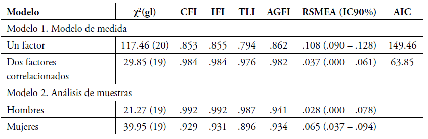 Los datos obtenidos muestran un buen ajuste con el modelo teórico que afirma la bidimensionalidad del constructo (ver Tabla 2) porque, a pesar de que el valor de chi-cuadrado es significativo (χ2 (19) = 29.85, p < .001), los valores de CFI (.98), IFI (.98) y TLI (.97) muestran claramente un buen ajuste de datos (el modelo hipotético debe rechazarse porque lo que se contrasta es la hipótesis nula de ajuste perfecto entre datos empíricos y teóricos). Finalmente, el valor de RMSEA fue .037 (IC del 90 % [.000, .061]), lo que indica un buen ajuste general del modelo de dos factores. Las cargas factoriales de todos los elementos oscilan entre .22 y .78.