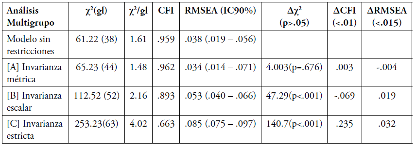 Los análisis multigrupo nos permitieron aplicar sucesivas restricciones al modelo de línea base (Tabla 3), el cual mostró que el modelo hipotético de la estructura del inventario de carnismo encaja bien en los dos grupos. Al comparar los modelos subsiguientes con restricciones adicionales al modelo de línea de base (en el Modelo A, se impusieron restricciones a las cargas factoriales; en el Modelo B, se impusieron restricciones a las cargas y varianzas de los factores; y en el Modelo C, se impusieron restricciones a las cargas factoriales, varianzas y covarianzas), los cambios en los valores de CFI y RMSEA fueron menores a .01 en el caso de la invarianza métrica, pero no así para el de la escalar y estricta, lo que cual permite establecer la invariancia de la escala solo de una manera parcial. Dicha invarianza vendría a significar que existe evidencia parcial de que el constructo evaluado posee el mismo significado para mujeres y hombres, indicando que los parámetros de intrumentos son similares para hombres y mujeres.