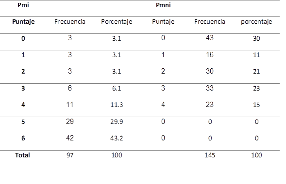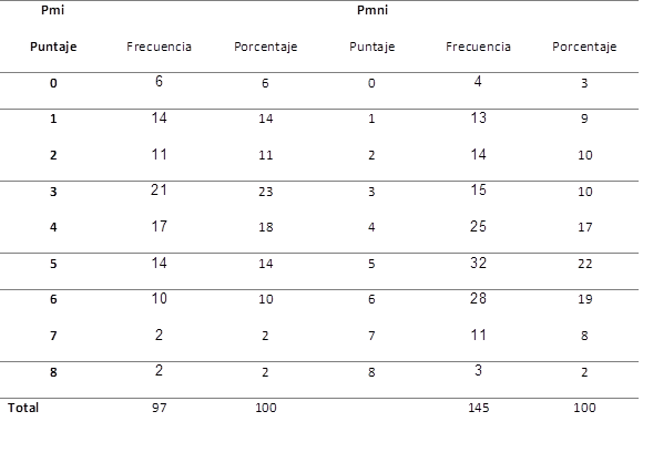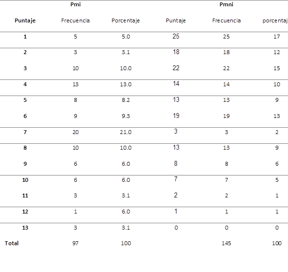 Para determinar la validez del instrumento se calculó el Alfa de Cronbach a partir de los resultados obtenidos de la aplicación del instrumento tanto en las Pmi como en las Pmni. En el caso de las Pmi se obtuvo un puntaje de 0,828, lo cual indica que el instrumento es consistente. En las Pmni se obtuvo un puntaje de 0,861, a partir del cual se puede concluir que este instrumento es consistente.