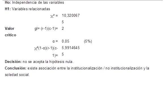 De igual manera, se efectuó una prueba de independencia entre las variables institucionalización, no institucionalización y soledad social, mediante prueba Chi cuadrado. Se realizó prueba de hipótesis: