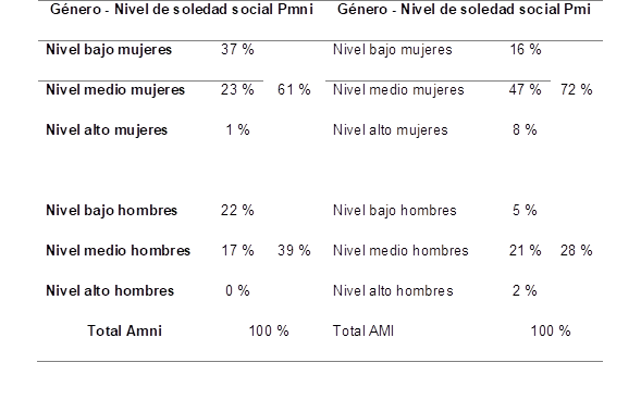 En lo relacionado con la variable de género, tal como se señala en la Tabla 2, en las Pmi predomina el nivel medio de soledad social: en las mujeres con un 47 % y el nivel medio de soledad social en los hombres con un 21 %; en las Pmni, en cambio, se destaca un nivel bajo de soledad social en mujeres con un 37 % y un nivel bajo en hombres con un 22 %.