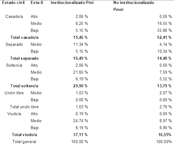 En la Tabla 3 se muestra que el nivel de soledad social en la población no institucionalizada es bajo en un 58.62 %, en cambio en la población institucionalizada el nivel bajo es solo del 22.68 %. Si se observan los datos por estado civil en la población no institucionalizada el nivel bajo está en casados con un 35.86 % y separados con 10.34 %, mientras que en la población institucionalizada el nivel más significativo es el medio en población soltera en un 21.65 % y viudos en un 24.74 %.