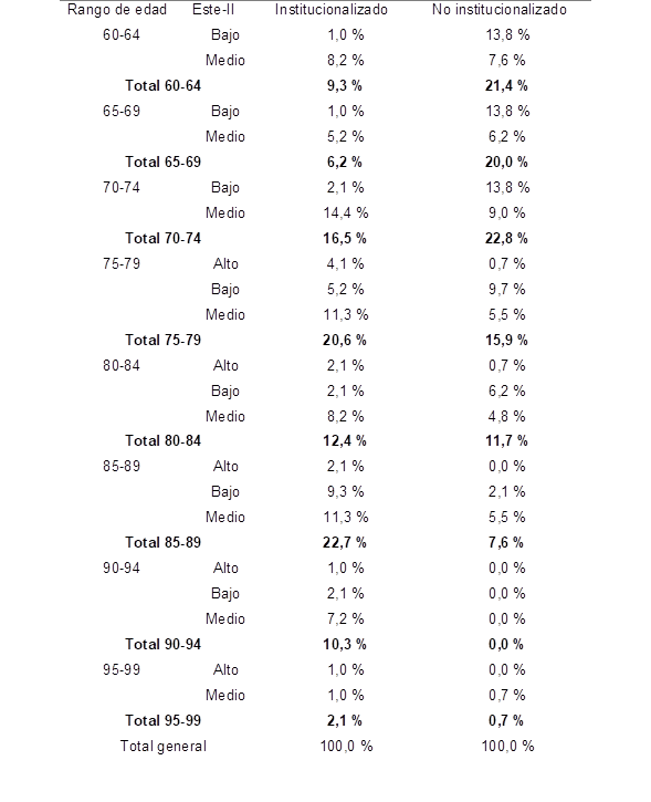 Mediante la caracterización y evaluación de los tres factores que componen la escala Este II, diferentes estudios (Arroyo et al., 2018; Castellanos et al., 2018; González de Vera, 2017; Hernández et al., 2018; Martínez et al., 2018; Tinco, 2017) han buscado explorar los índices de envejecimiento y necesidades de cuidado en personas mayores.