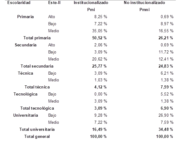 En cuanto al grado de escolaridad, según los datos observados en la Tabla 5, la tendencia en las Pmni es que a mayor grado de escolaridad menor es el nivel de soledad social lo que se evidencia en un 59.32 % de nivel bajo de soledad social y de ese porcentaje el 26.90 % alcanzó grado universitario, en cambio en la población mayor institucionalizada solo el 19.68 % presenta un nivel bajo de soledad social y de ellos el 9.28 % alcanzó grado universitario. Se asume que el grado de escolaridad también está relacionado con el uso de tecnologías. En cambio, para las Pmi la tendencia es contraria: a menor grado de escolaridad, el nivel de soledad social es media; en las personas mayores que alcanzaron un título universitario y que están institucionalizadas, el nivel de soledad social es alto y medio, respectivamente.