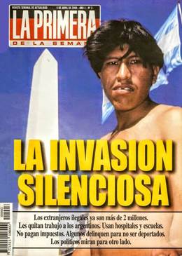 El mismo refuerzo de la extranjería logra la figura de la «invasión» que, como con los pueblos originarios, también se usa con los inmigrantes. Una de las ocasiones más virulentas en que se utilizó fue en abril de 2000, cuando la revista La Primera presentó como nota de tapa «La invasión silenciosa», que reunía una serie de acusaciones («quitan trabajo», «usan hospitales y escuelas», «no pagan impuestos», «delinquen») sobre el fondo de una gran foto trucada, en la que un hombre de piel cobriza y cabello oscuro, con el torso desnudo y al que el Photoshop había privado de un diente, se sobreimprimía al obelisco porteño y la bandera argentina (Figura 1).