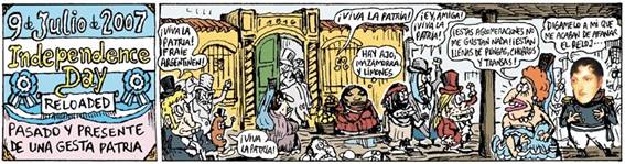 Dada la relevancia de las apariencias, la cultura visual mediática ofrece otro ejemplo en el que vale la pena detenerse. Se trata de una tira cómica aparecida el 09 de julio de 2007 en el diario Clarín. La primera viñeta presenta el tema de la celebración de la independencia con bandera, escarapelas y cintas de color celeste y blanco. La segunda muestra una escena. Como fondo se ve la «Casa de Tucumán», símbolo de los hechos de aquel día. Delante del edificio, los personajes habituales de esta tira diaria vestidos con indumentaria de la época. Catalina, una inmigrante boliviana que siempre aparece en su puesto de verduras en las calles porteñas, está aquí sentada al lado de la puerta de entrada de la casa, vendiendo «ajo, mazamorra y limones». Hacia el centro del cuadro, los tres personajes conocidos como «pibes chorros»9 dan vivas a la patria. Al menos dos de ellos visten ropas populares de comienzos del siglo XIX y uno de ellos, blanco en la tira diaria, tiene esta vez su piel de color negro (Figura 2).