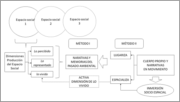 Respecto de este último eje, el relato de recorrido que surge en la inmersión socio espacial, estimula las narrativas del pasado ambiental; las formas de producción del espacio social: lo percibido, lo representado y lo vivido de Lefebvre-, planteamos que la enunciación de esta última dimensión «lo vivido» desde el presente vivo lugarizado -(estando ahí)-, activa la memoria de una creatividad latente, o dormida (que emerge de la encarnación sensitiva del estar/ser ahí en inmersión), y que es menos fácil de rememorar en un ejercicio nemotécnico realizado a la distancia tanto temporal como espacial.
