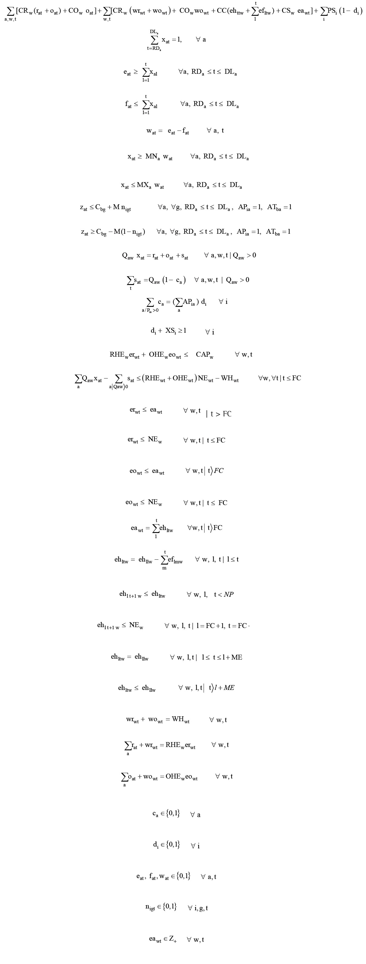 In terms of internal capacity, the availability of working hours per period per work centre is proportional to the number of employees allocated in each work centre. Average workforce productivity is considered to define the processing times for the activities. Furthermore, the proposed model admits the use of capacity flexibility by considering nonregular capacity alternatives. In this sense, the availability of working hours may be modified using an overtime working shift or by hiring or firing personnel. To minimize capacity changes though, the model considers a minimum employment period that restricts dismissing personnel before this period of time and associates a capacity change cost proportional to the number of employees hired or fired.