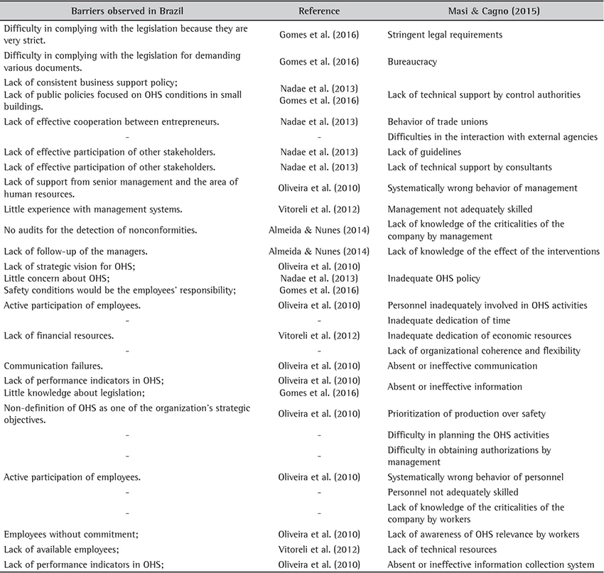 Most studies on OHS deal only with the perspective of owners/managers, neglecting the opinion of other stakeholders involved, to determine existing barriers to the management of OHS in small enterprises (Champoux & Brun, 2003; Masi & Cagno, 2015; Cagno et al., 2016; Nowrouzi et al., 2016). In Brazil, some of these barriers have been individually identified through case studies (Vitoreli et al., 2012; Nadae et al., 2013). Thus far, no systematic study of barriers has been conducted in Brazil. In this regard, such barriers must be investigated to understand difficulties in managing the health and safety of its company employees. This research aims to determine main barriers to the implementation of OHSMS in the context of small Brazilian enterprises and from three different perspectives: owners/managers, labor auditors, and OHS consultants.