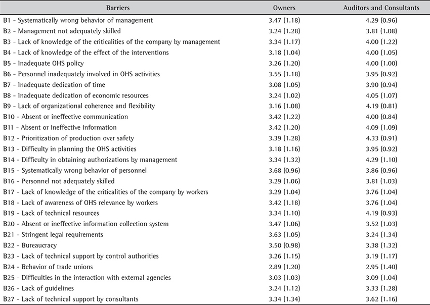 The absence of information or its ineffectiveness obtained the eighth highest average for owners and the sixth for consultants and auditors. Oliveira et al. (2010) verified lack of OHS performance indicators and company data as barriers. Gomes et al. (2016) observed lack of knowledge about the legislation as limiter for OHS management. Masi & Cagno (2015) and Nowrouzi et al. (2016) also reported that this parameter is a top barrier. Hadjimanolis et al. (2015) proved the positive relationship of safety information to OHS performance; the main causes of this barrier are the isolation of the owner/manager and lack of knowledge of the risks of the company (Champoux & Brun, 2003).