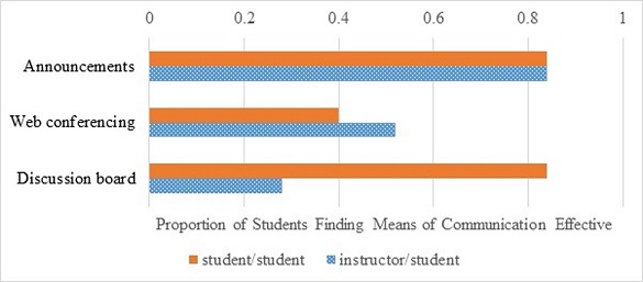 In addition to the documentary analysis, a post-course survey sought to investigate the means by which students communicated with one another, as well as with the instructor over the duration of the semester. Students were asked to evaluate how effectively they were able to communicate using the announcements section and discussion board of the learning management system (LMS), as well as the web conferencing tools provided in the course. Results, shown in Figure 1 , suggest the announcements section effectively facilitated communication between students, as well as between the students and instructor.