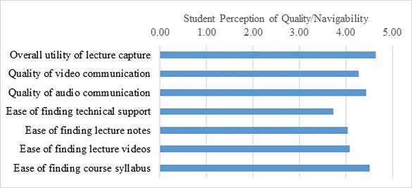 Students also found the course site to be relatively easy to navigate using the LMS. The course syllabus (4.52), lecture notes (4.04), and lecture capture video (4.08) all scored highly in this regard. One noted limitation was the students’ ability to effectively engage technical support, particularly when problems arose with respect to the lecture capture video (3.74). This is an area where the instructional support organization can focus on improvements for future offerings.