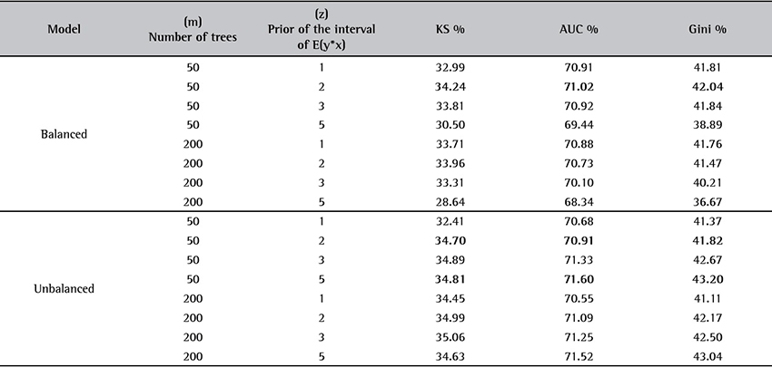 First, models were adjusted using the standard parameters for the prior suggested by Chipman et al. (2010) , with number of trees, m , equal to 50 and . In addition to the default models with 200-size trees were also adjusted, and 4 values for z (1, 2, 3 and 5) were tested, which specifies that the prior distribution for be within an interval between and is 68.27%, 95.45%, 99.73% and approximately 100%, respectively. These parameters combined with one another and applied to the two databases generated sixteen models. Table 5 summarizes the performance of the method for the validation database.
