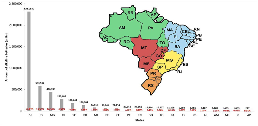 Figure 2 shows the amount of 4,304,465 alkaline batteries collected through reverse logistics in 2012, considering the sum of the collections in the states. The amount of batteries collected in São Paulo (SP) State in 2012 exceeded by more than three times the amount collected by Rio Grande do Sul (RS) State that stands in the second place. States that collected smaller amounts than this first two were respectively Alagoas (AL), Amazonas (AM), Mato Grosso do Sul (MS), Piauí (PI) and Amapá (AP). Additionally, in Mato Grosso do Sul a more meaningful collection would be expected due to its better economic situation compared with other states. In this regard, it is expected that the extension of the ABINEE’s program to that state can be even better structured in terms of collection points than in other states countrywide.