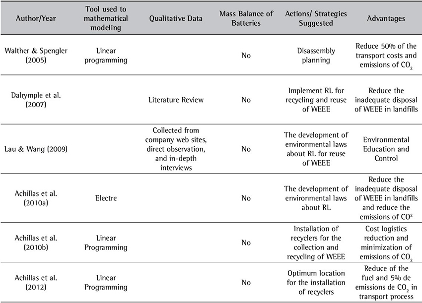 Assavapokee & Wongthatsanekorn (2012) adopted linear programming and identify the absence of rigid federal prohibitive legislation to prevent e-waste from going to dumps and landfills in Texas, USA. A problem that if not treated as a priority, in a long-term basis could cause serious damage to the environment. Kochan et al. (2015) developed the survey in students in the USA and identify that the communit of the Texas are correctly disposing of WEEE. Walther & Spengler (2005) mentioned that the develop the disassembly planning by means of linear programming to contribute with the WEEE-directive on reverse logistics in Germany. Thus, is possible to reduce 50% of the transport costs and emissions of CO2 with adoption of RL. The literature review developed by Dalrymple et al. (2007) identified that the WEEE as one of the fastest growing sources of waste in the EU. Thus, is estimated to increase by 16‐28 per cent every five years, denoting the importance of develop research and adoption about RL in organizational practice.