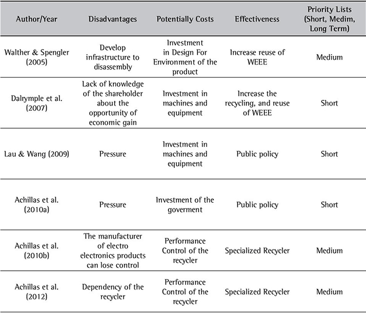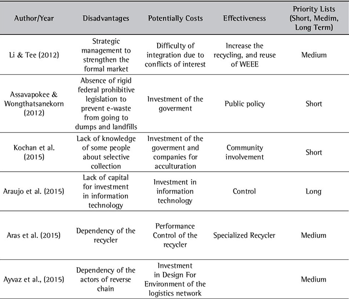 The researches identified environmental gain through the adoption of reverse logistics of WEEE with the use of mathematical simulations in terms of the optimal location of recyclers and manufacturers of electroelectronic products and qualitative data. The “actions” related to the RL, advantages, disadvantages, potential costs and the effectiveness of each proposed action were identified. In addition, the “priority list” of actions was developed to be applied in a short, medium and long term, according to Table 1 . In short term, the development of public policies regarding the advantages of the adoption of reverse logistics by means of environmental education and control for the society and shareholders awareness becomes highly significant. Thus, the society would assist in the selective collection and the shareholders could adopt reverse logistics for the recycling, reuse and adequate disposal with focus on economic and environmental gains. In medium term, the companies could adopt the design for environment in the product focusing on disassembly and remanufacturing as well as adopt the design for environment in logistics network to identify and establish integration with recyclers with optimum localization to reduce the fuel consumption in transportation process. Thus, it would increase the quantity of recycling, contributing with the reduction of environmental impact. In long term, the use of information technology is suggested, such as RFID, which controls the quantity of recycled materials. In addition, developing carbon credit assessment of companies that adopted reverse logistics for the carbons market is important to highlight.