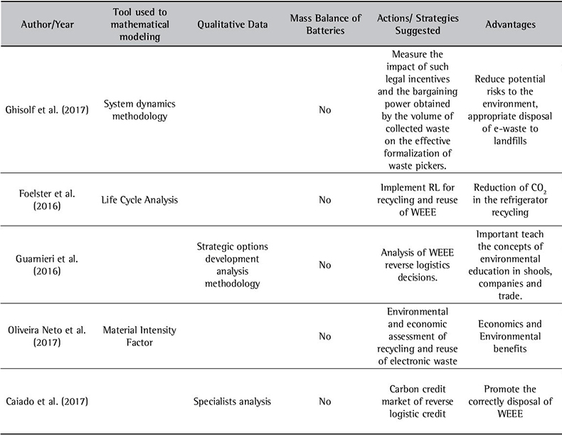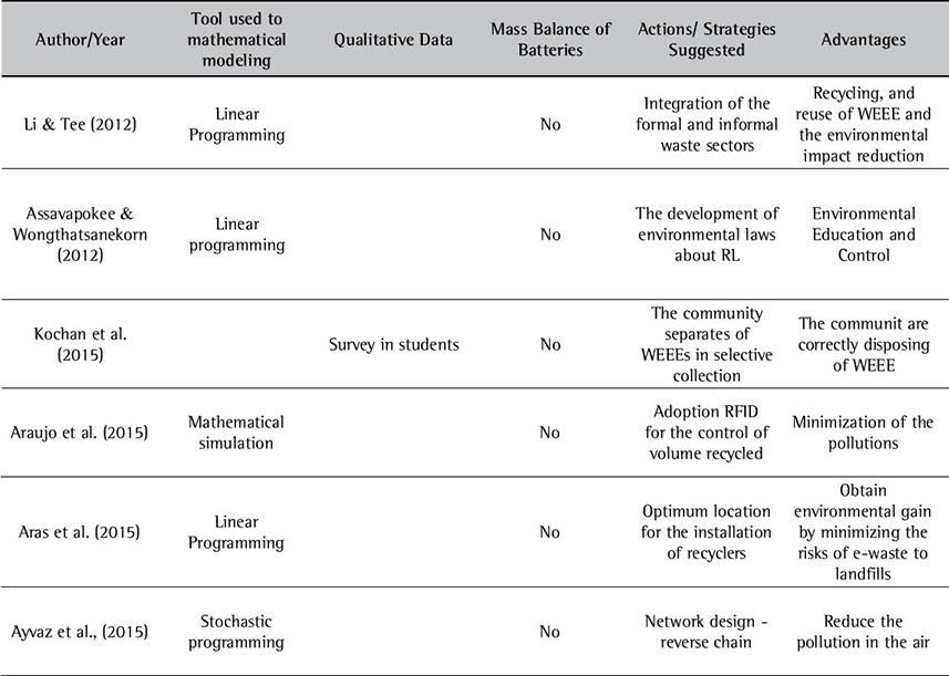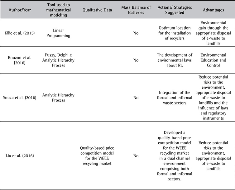 Thus, 35 papers were identified. After, the content were analysed of the papers to identify the studies about environmental benefits with adption of WEEE reverse logistics. It were selected 21 works about subject. The 14 papers excluded mention the key words in references or recluse in parts of the manuscript. Thus, the content of the papers was analyzed in terms of: tool used to mathematical modelling, only qualitative data and/or mass balance of batteries, actions/strategies, advantages, disadvantages, potential costs, effectiveness and priority lists (short, medim, long term), according table 1 .
