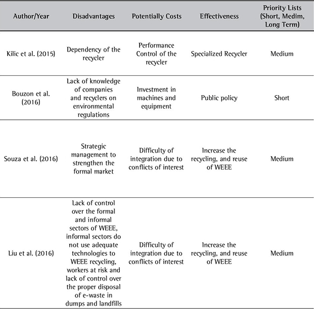 Other researches carried out in Brazil mentioned qualitative data about the subject. Guarnieri et al. (2016) performed the analysis of reverse logistics of e-waste using strategic options development analysis methodology. The findings present that to increase the adoption of reverse logistics of e-waste in Brazil, is important to teach the concepts of environmental education in schools, companies and trade. In addition, Caiado et al. (2017) carried out specialists analysis about RL carbon credit market, denoting the opportunity to promove the correctly disposal of WEEE. Oliveira Neto et al. (2017) develop the environmental and economic assessment of recycling and reuse of electronic waste in Brazil and Switzerland. The results showed that the Brazilian recyclers need to invest in process of recycling and reuse of printed circuit boards, because with this process the recyclers could extract precious metals for sale increasing the economic gain