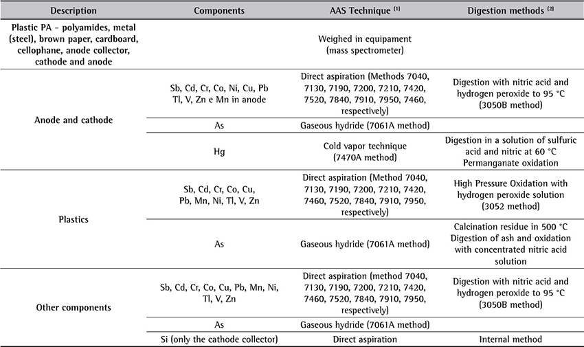After identifying the amount of batteries, a mass balance was developed to calculate the minimization of environmental impact. Almeida et al. (2006) showed the components (both solid and chemical waste) found in a battery having 35 grams as an average weight. The paper of Almeida et al. (2006) was selected because developed the chemical analysis of the components of the batteries by means of Atomic Absorption Spectrometry (AAS) and the 3052 digestion method. Thus, the methodology used is adequade to develop the mass balance of batteries, according to Almeida et al. (2006) .