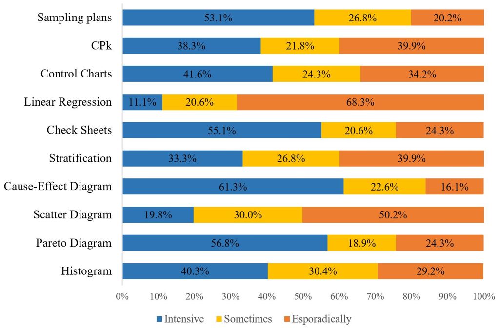The performance of manufacturing processes in the previous 3 years, perceived as influenced by the use of STk and STe, was evaluated both by objective indicators, such as nonconformity indices, and by subjective indicators of perceived satisfaction with STk and STe, such as greater commitment to the control and improvement of the process by professionals who participate in the improvement actions at a tactical and operational level.