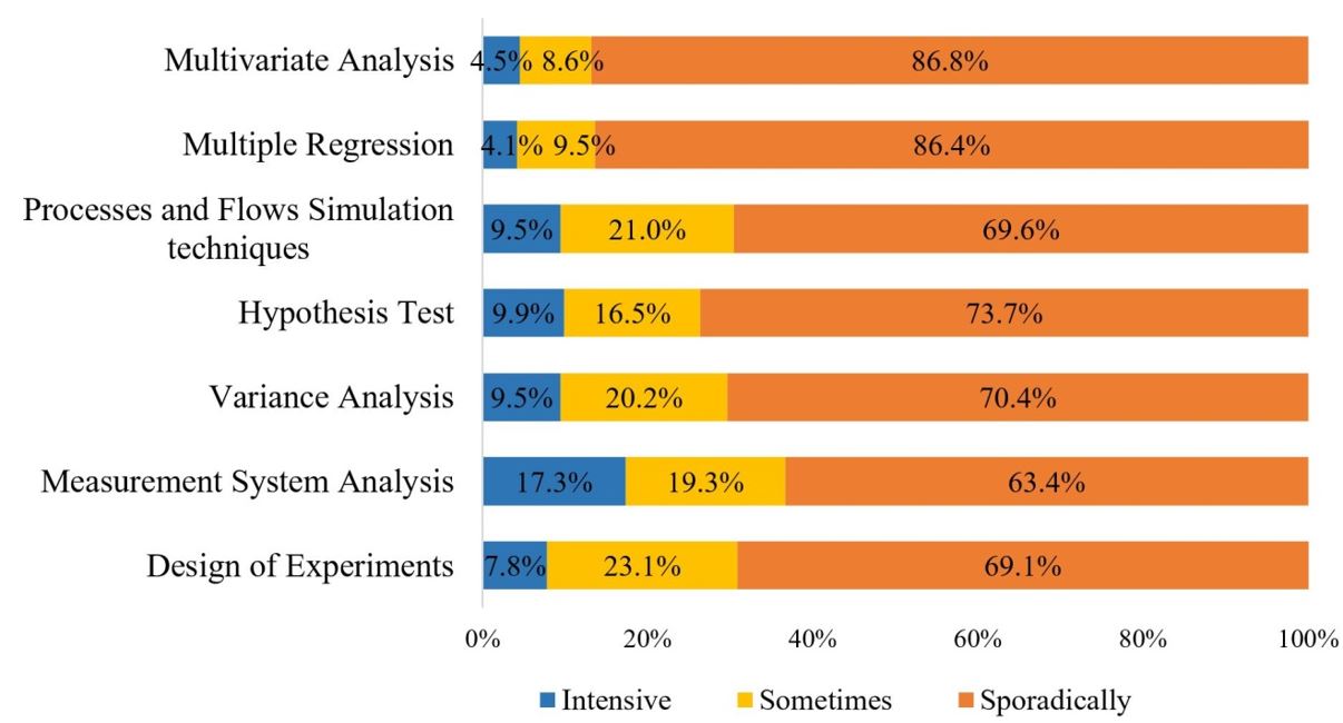 From the survey on the intensity of use of basic, intermediate and advanced statistical techniques ( Figures 1 and 2 ), it is observed that only a few basic and intermediate techniques are being used more intensely, such as the Pareto Diagrams, Cause-Effect Diagrams, Check Sheets and Sampling Plans. These techniques are used in more than 50% of the companies of the sample. Scatter Diagrams and Linear Regressions, two well-connected tools, are only used sporadically (never or rarely). More complex tools are also used in greater proportion only sporadically, since for all advanced STe there were more than 63% of the responses concentrated in sporadic use. Multiple Regression and Multivariate Analysis techniques are never used by 63.4% and 65% of firms, respectively.