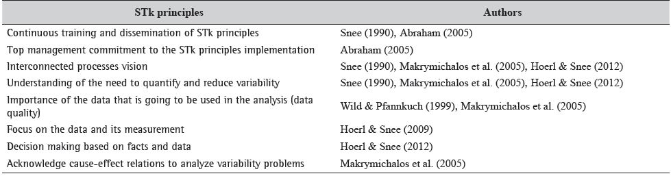 Using a Principal Components Analysis, that encompassed the principles of STk, the focus on data and quantification of process variability was highlighted by the interrelationship of a set of STk concepts that is more closely related to the application of STe, and that support the quantification and analysis of variability. The managerial support for diffusion of the STk principles appears less intensely in a joint analysis, as well as the process vision.