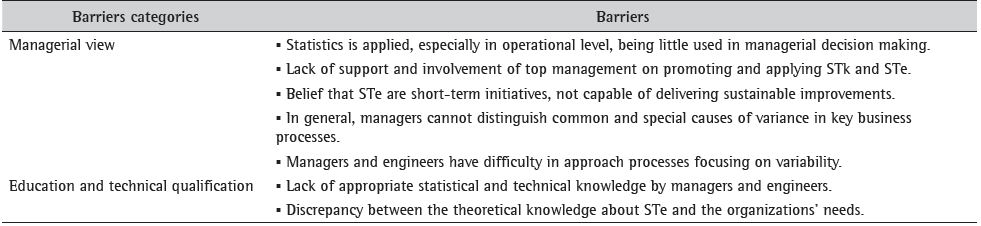 A study by Ahmed & Hassan (2003) with Malaysian industrial companies showed that the lack of support and involvement of top management, coupled with the lack of appropriate statistical knowledge, compromised the implementation of STe. Grigg & Walls (2007) also reported the lack of management support, the lack of statistical knowledge, and the inadequate system of data measurement and collection as barriers to the implementation of STe in companies.