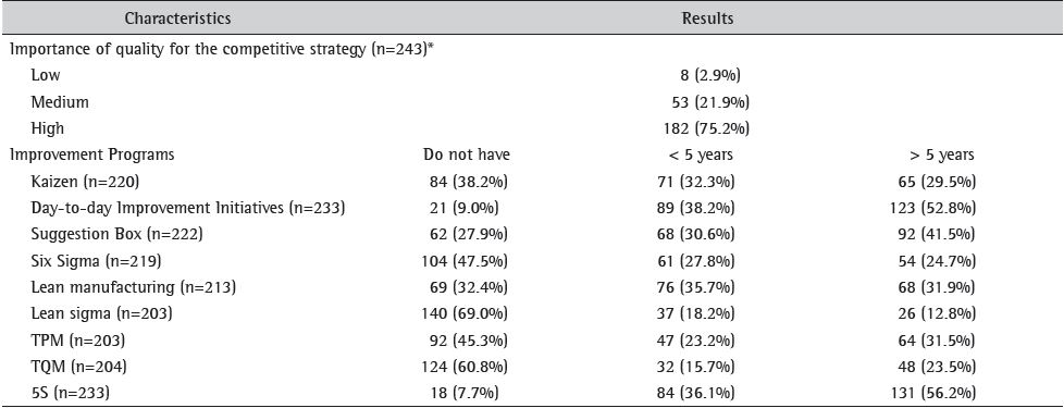Among the 243 respondents, 152 companies (62.6%) have more than 500 employees and 91 companies (36.4%) have between 100 and 500 employees. The most frequent certifications are: ISO 9001 (67.5%); ISO 14001 (43.2%); GMP/HACCP (21.8%); TS 16949 (12.8%); ISO 22000 (7.4%); OHSAS 18001 (5.8%); ISO 17025 (3.7%). In most cases, respondents attributed a high degree of importance to quality in company's competitive strategy (75.2% of the sample).