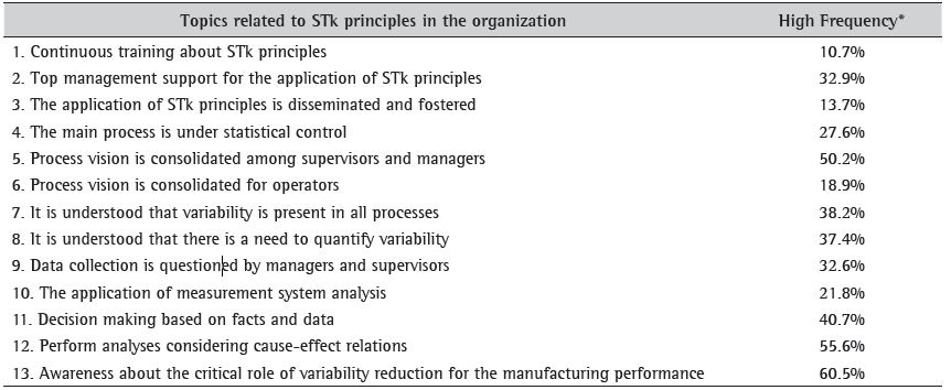 Table 5 show that, in general, there is appreciation and concern about the use of STk. It is noticed that the understanding of how critical the variability reduction is for manufacturing performance (item 13) has been achieved, with high frequency in 60.5% of the companies; the consideration of cause-effect relations in the analysis of products and processes data (item 12) in 55.6%; and consolidation of process vision at the supervisory and management level (item 5) in 50.2% of the companies. On the other hand, continuous training on STk principles (item 1) occurs with high frequency in only 10.7% of the companies; the dissemination of the application of STk principles (item 3) in only 13.7%; and the process vision has been consolidated at the level of operators (item 6) in a high frequency in only 18.9% of the companies.