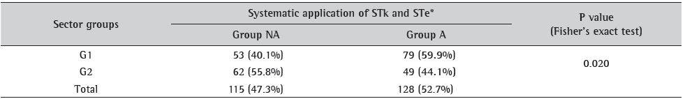 This group of sectors was called G1. In this group, 59.9% of the companies systematically apply STk and STe. The G2 group is constituted of companies in the Pharmaceutical, Serial capital goods and Chemical industry, in which the proportion of companies that systematically use STk and STe is lower than those that do not. In G2, 44.1% of companies apply STk and STe. This difference is statistically significant, at the significance level of 5%, by Fisher's exact test (P value = 0.020), which shows that there may be distinction regarding the importance of statistics in management and quality improvement areas, depending on the industrial sectors that are part of the group. It also suggests possible differences in managerial vision regarding the potential and application of STk and STe in production routine, depending on the sector.