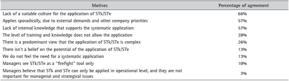 With respect to difficulties for the application of STk and STe, the lack of suitable culture and knowledge are still perceived as barriers to be overcome. Companies did not consider that the lack of preventive vision and the lack of vision of the potential of the application in the operational and managerial level are reasons for its non-application. It can be assumed that the importance of the application is already diffused in the companies, however, lacking in effective and routine use, in agreement with Ahmed & Hassan (2003) and Bergquist & Albing (2006) results.