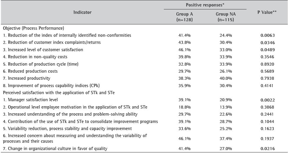 For the indicators of perceived satisfaction with the application of STk and STe, the statistically significant difference between groups A and NA was evident for: “manager’s level of satisfaction on the application of STk and STe” (P = 0.0022); and “change of organizational culture in favor of quality” (P = 0.0216). For the other indicators of this category there was no statistically significant difference (P > 0.05). Although the comparison for the indicator “Contribution of the application of STk and STe for consolidation of improvement programs” presented a P value of 0.1044, it indicates potential perception of impact of STk and STe on improvement programs.