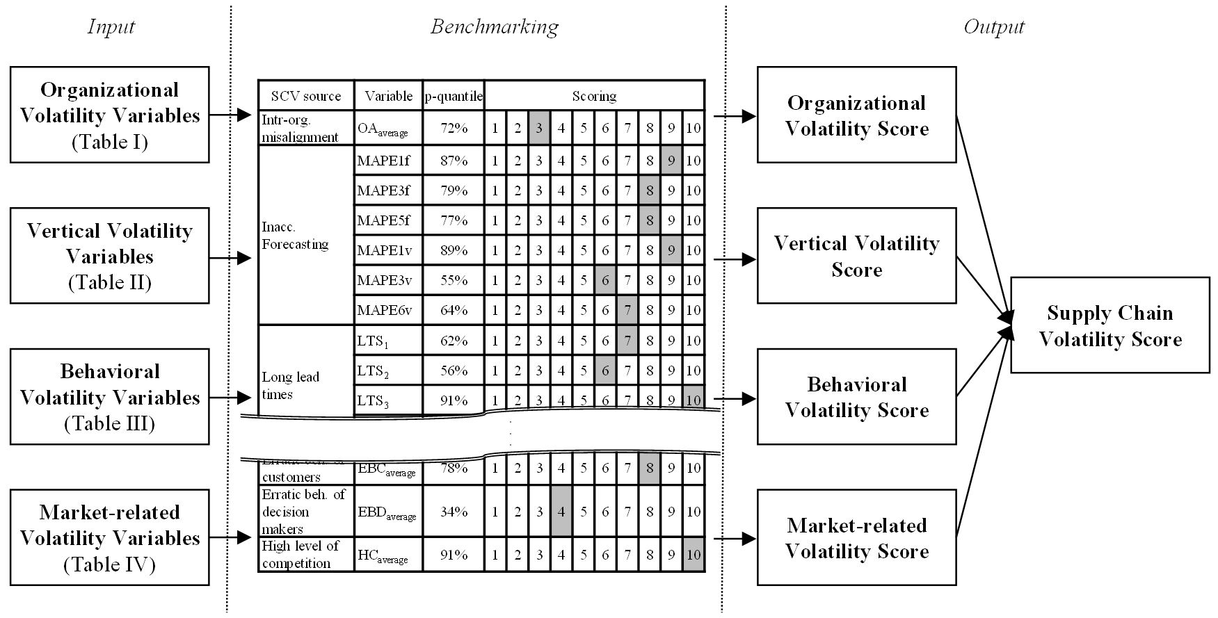 Paper aims: The study proposes a benchmarking instrument that enables managers to critically assess the volatility management performance of a product’s supply chain to identify areas on which to focus when managing supply chain volatility (SCV).