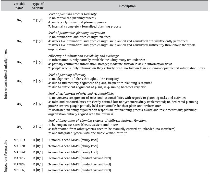 Organizational volatility is mainly caused by intra-organizational misalignment and inaccurate forecasting (Nitsche, 2018). Based on a survey among 88 manufacturing companies, Wagner et al. (2014) investigated how companies can align their organization by means of sales and operations planning (S&OP). Building on this, they proposed an S&OP maturity model that outlines the different areas of intra-organizational alignment as well as the embodiment of each maturity level. Based on that, in the proposed benchmarking instrument, intra-organizational misalignment will be measured qualitatively via six distinct characteristics of organizational alignment (formality of the planning process, promotions planning integration, information availability and exchange, planning efficiency, assignment of roles and responsibilities, and integration of planning systems) using the proposed maturity level descriptions of Wagner et al. (2014), as shown in Table 1. The rating of those maturity levels is performed, via a self-assessment by the user of the benchmarking instrument, on a scale from 1 (low maturity level) to 7 (high maturity level). Descriptions for maturity levels 1, 4 and 7 are given (see Table 1), but the user is also free to choose intermediate maturity levels. It has to be stated that, for all qualitative variables of the benchmarking instrument, it is recommended that different perspectives from different relevant departments of the manufacturer are included in this self-assessment process.
