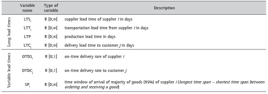To assess SCV induced by long lead times (SCLLT), different input variables have been defined, as shown in Table 2. SCLLT itself incorporates four sub-scores for the impact of supplier lead time (SCLTS), transportation lead time (SCLTT), production lead time (SCLTP), and delivery lead time (SCLTC).