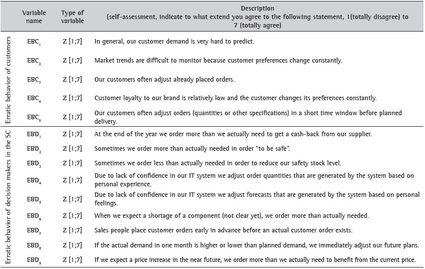 Erratic behavior of customers is characterized by unpredictable customer demand that causes a supply and demand mismatch at the focal firm (Childerhouse et al., 2008; Germain et al., 2008). This can be caused by changing customer preferences, fads, short-term order changes or cancellations, and others (Childerhouse et al., 2008; Germain et al., 2008; Johnson, 2001; So & Zheng, 2003; Van der Vorst et al., 1998). Erratic behavior of decision makers in the supply chain involves decisions that are perceived as irrational from the recipient’s point of view (Nitsche, 2018) because they induce volatility along the supply chain. This can be caused by overreactions to certain demand signals (e.g., higher orders than usual, expected shortages), forward buying, ordering more than needed, drastically reducing safety stocks, and others (Lee et al., 1997; Lee, 2002; Nienhaus et al., 2006; Nyoman Pujawan, 2004; Wong & Hvolby, 2007). The variables chosen to measure SCV caused by both sources are depicted in Table 3.