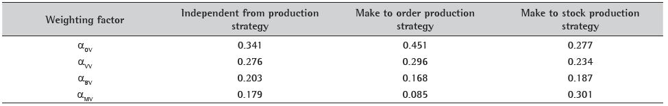To calculate the total SCV score (SCSCV) of a product, SC, SCOV, SCVV, SCBV, and SCMV are necessary. As proposed by Nitsche (2018), the corresponding four volatility dimensions do not impact SCV equally. Based on an AHP among SC practitioners, Nitsche (2018) assessed the impact of those four dimensions on SCV. In addition, he contextualized this impact by the production strategy of the manufacturing firm and proposed that the impacts of those four dimensions differ significantly between make to order and make to stock supply chains. Building on these findings, it is prosed to apply Nitsche (2018) proposed weightings to calculate SCSCV, and the weighing factor α is therefore introduced. The user of the benchmarking instrument has to decide whether he wants to apply the overall weighting factors including all production strategies (including engineer to order), or the weighting factors for either make to order or make to stock production strategies, as proposed by Nitsche (2018). The corresponding weightings are outlined in Table 5.