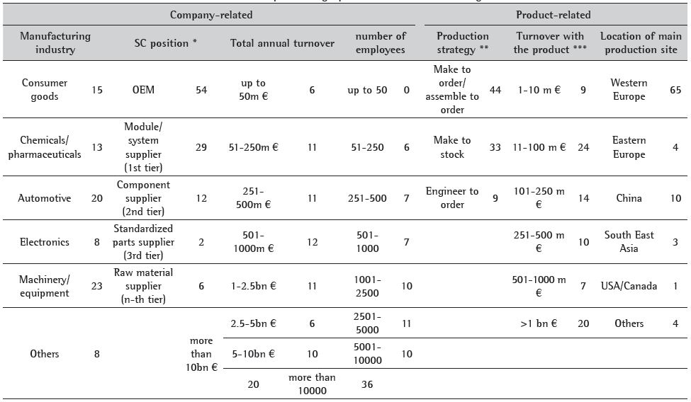 To gather required benchmarking data, a survey among manufacturing firms operating in different industries was conducted from June to July 2018. This was intended to cover a heterogeneous group drawn from different types of manufacturing firms. To complete the survey, participants first had to fill in general company-related data and afterwards had to think of a representative product that is manufactured by their company and that they know very well. Subsequently, all questions were asked with reference to the representative product. In total, 87 responses were collected from different manufacturing industries, mainly from the machinery/equipment, automotive, consumer goods, and chemicals/pharmaceuticals sectors. The surveyed products mostly had make to order/assemble to order and make to stock production strategies, and their production sites were mostly located in western Europe. The sample demographics are outlined in Table 6.