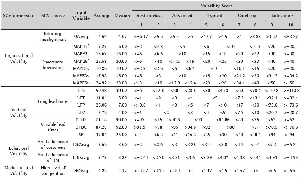 Although long lead times induce SCV, they could be manageable if lead times are always accurate and therefore plannable. In reality, real-world SC lead times vary, making the planning process inaccurate, which consequently causes SCV. To include this aspect in the SCV benchmarking instrument, the source of variable lead times will also be assessed. Therefore, the on-time delivery rate (OTDR, percentage of goods delivered on time (Chan, 2003)) of suppliers of A-level components of the product as well as the OTDR to the A-level customers has to be stated as an indicator of variable lead times. Additionally, the spread of lead times at the supply side is benchmarked by asking the user to indicate, for the majority of deliveries (set at 95%), the minimum and maximum times required to order them from the supplier and have them shipped to and received at the production site. The necessary variables to assess the level of vertical volatility are outlined in Table 2.