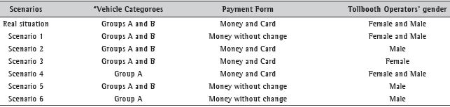 However, after the validated model, six scenarios were defined beyond the real situation in order to analyze the system behavior in relation to the differences among the factors of vehicle category, shift, payment form, and the tollbooth operator’s gender, according to data presented in Table 3.