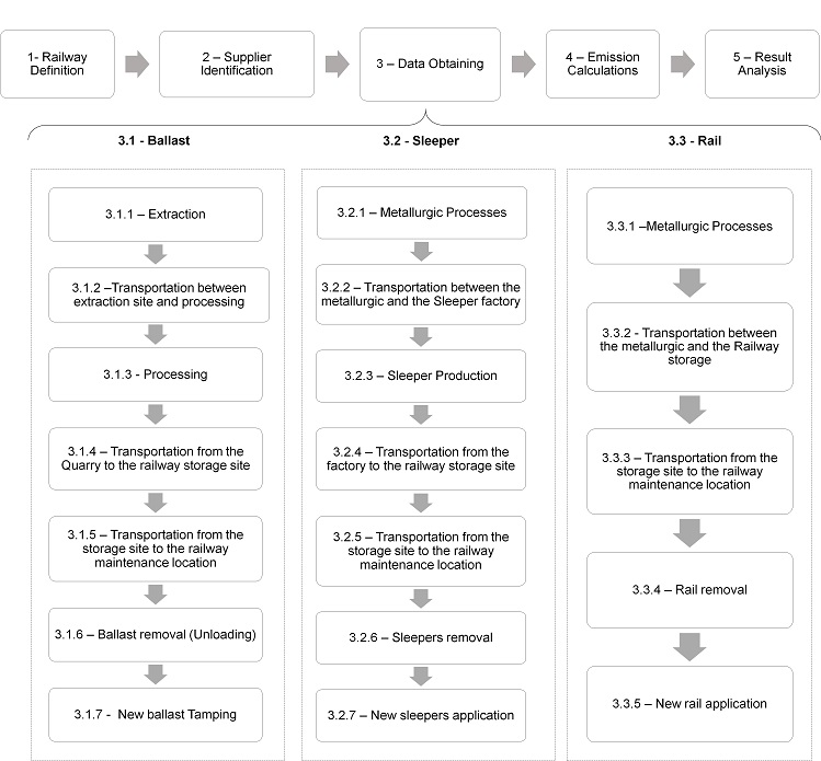 The system frontiers define the processes that will be a part of the life cycle analysis of each product. Step 3, Figure 1, is divided in three stages, each is divided, in several sub-stages, described next. Stages For 3.1, 3.2 and 3.3 deals, respectively with the ballast, the sleeper and the rail. They represent the system frontiers.