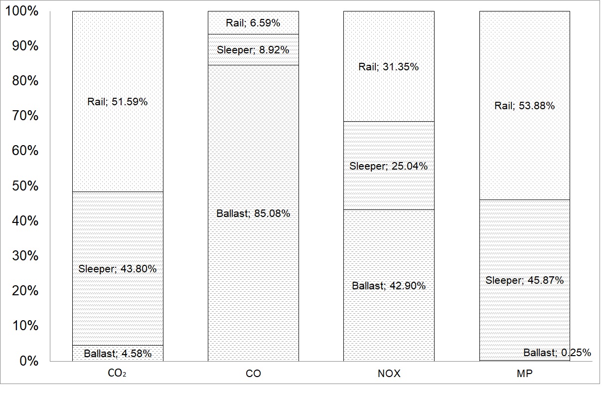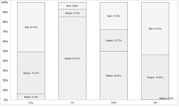 Table 3 shows that for CO2, NOx and MP, the emissions caused mainly by the sleeper and the rail maintenance process, especially in the production and material delivery phase. For the ballast maintenance process, the highest emissions are caused by the transportation phase from the railway storage site to the track maintenance location. The ballast maintenance process emissions on this phase is higher than the rail and the sleeper maintenance process because, although the same locomotive is used on their transportations, the speed is different. The ballast supplier is located near the railway storage site, thus, emissions coming from the delivery phase is close to zero.
