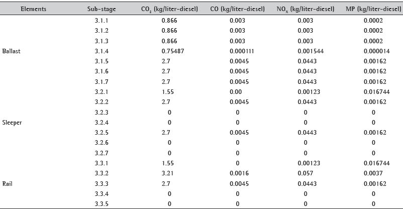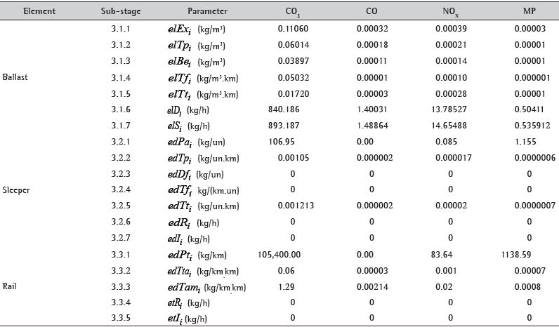 On sub-stage 3.1.5 (transportation from the railway storage site to the railway maintenance location) it is used a train with on GE BB-40 electric diesel locomotive pulling 40 wagons, with capacity of 22 m3/wagon, its speed is 50 km/h, consuming 280.35 liters-diesel/hour. Locomotive GE BB-40 emissions were calculated by Carvalhaes et al. (2017). On sub-stage 3.1.6 (removal of the ballast) it is used a ballast unloader machine, it operates 1 km of track in 4,5h, consuming 311.18 liters-diesel/hour. On sub-stage 3.1.7 it is used a tamper machine, it operates 1 km of track in 6 hours, consuming 330.81 liters-diesel/hour. The emissions of sub-stages 3.1.6 and 3.1.7 were considered equal to a diesel-electric GE BB-40 locomotive.