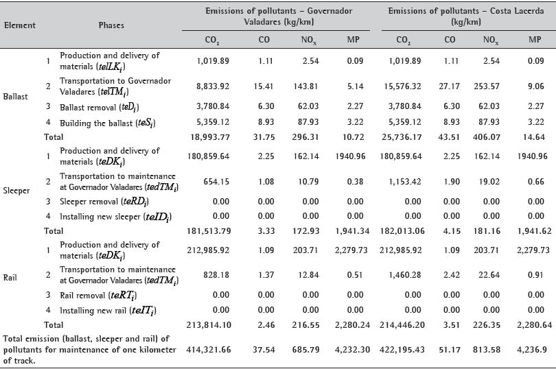 Table 3 represent, respectively, ballast life cycle pollutant emissions at the track maintenance location close to Governador Valadares and Costa Lacerda train stations. For sake of simplicity, from now on, we will mention only Governador Valadares and Costa Lacerda.