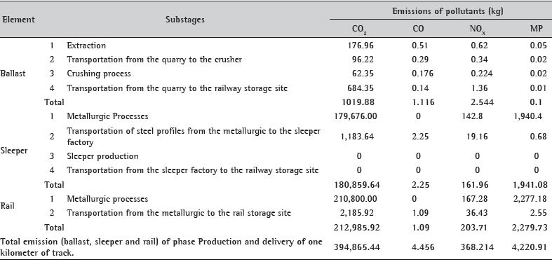 Considering the big influence of the phase of production and material delivery, Table 4 shows, respectively, the emissions of each sub-stage composing the phase of the ballast, the sleeper and the rail, considering the track maintenance at Governador Valadares. Thus, it is possible to analyze which sub-stage is responsible for the emissions.